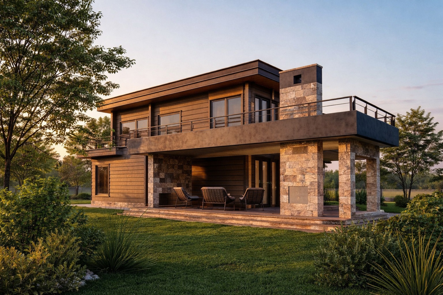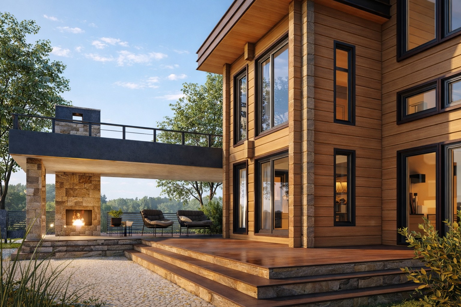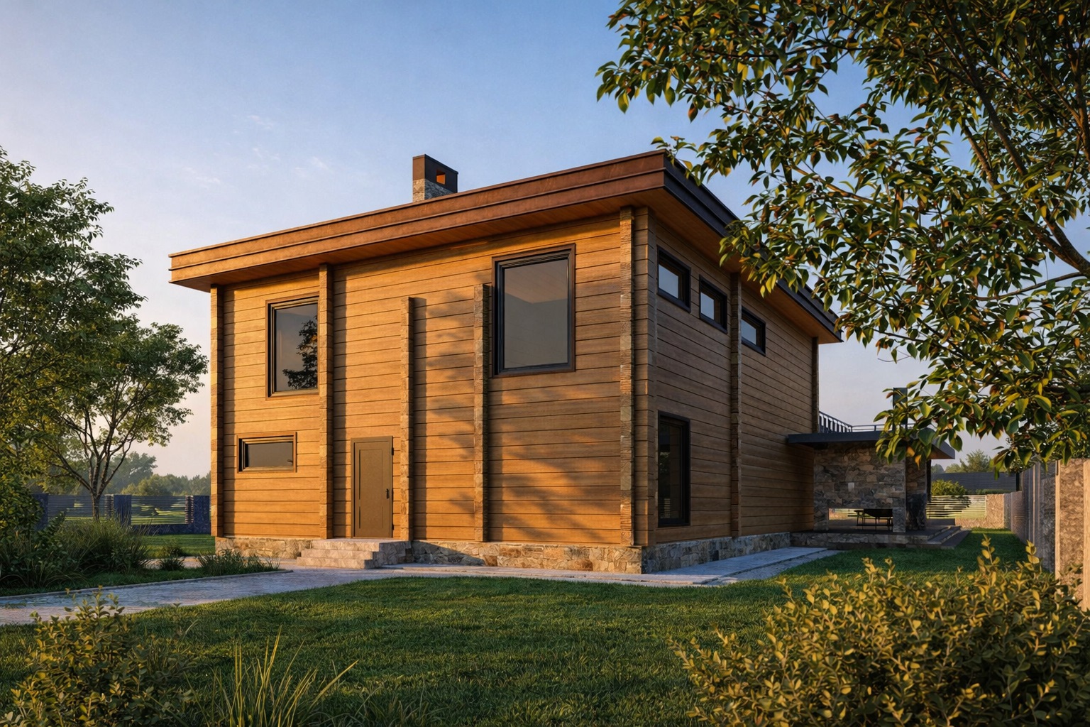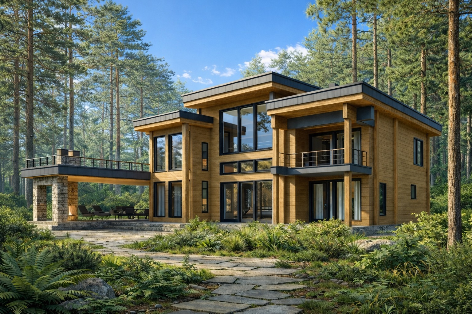 Современный коттедж из клееного бруса в стиле «Хай-тек» с полноценным вторым этажом для постоянного проживания до 8-ми человек. Объединенное общее пространство, включающее холл, кухню, столовую и гостиную со вторым светом 69 кв.м. Вместительная гардеробная, кладовая, рабочий кабинет, 4 уютные спальни. 2 красивых балкона, открытая терраса.